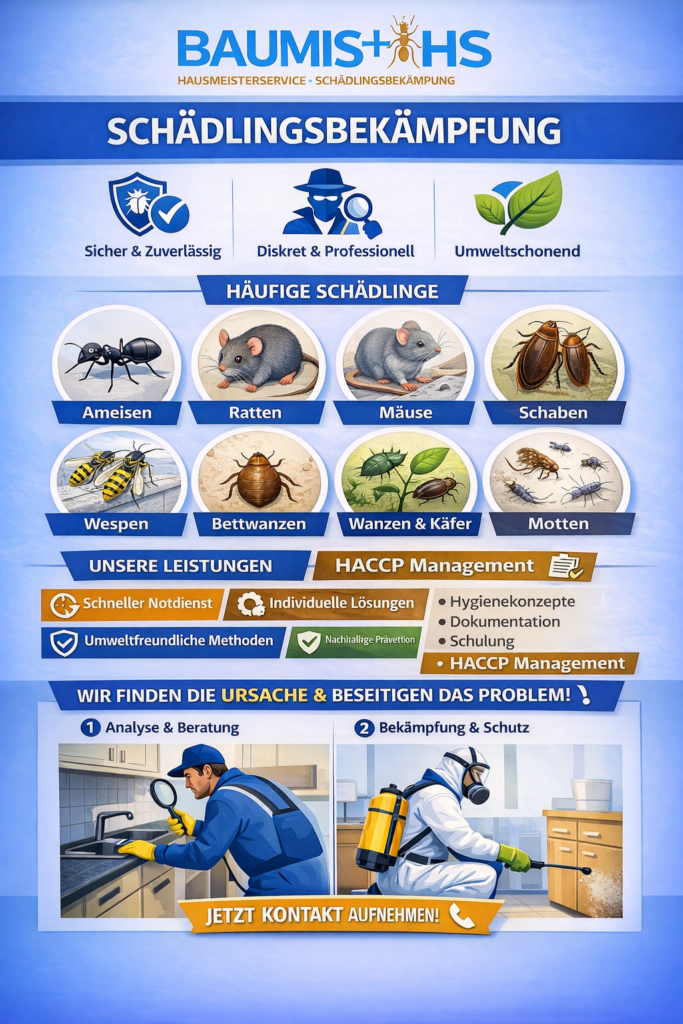 Ungeziefer in Haus, Wohnung oder Betrieb ist nicht nur lästig, sondern kann auch ein ernsthaftes Gesundheits- und Hygienerisiko darstellen. Wir sind Ihr zuverlässiger Partner für effektive und fachgerechte Schädlingsbekämpfung – diskret, nachhaltig und gesetzeskonform.